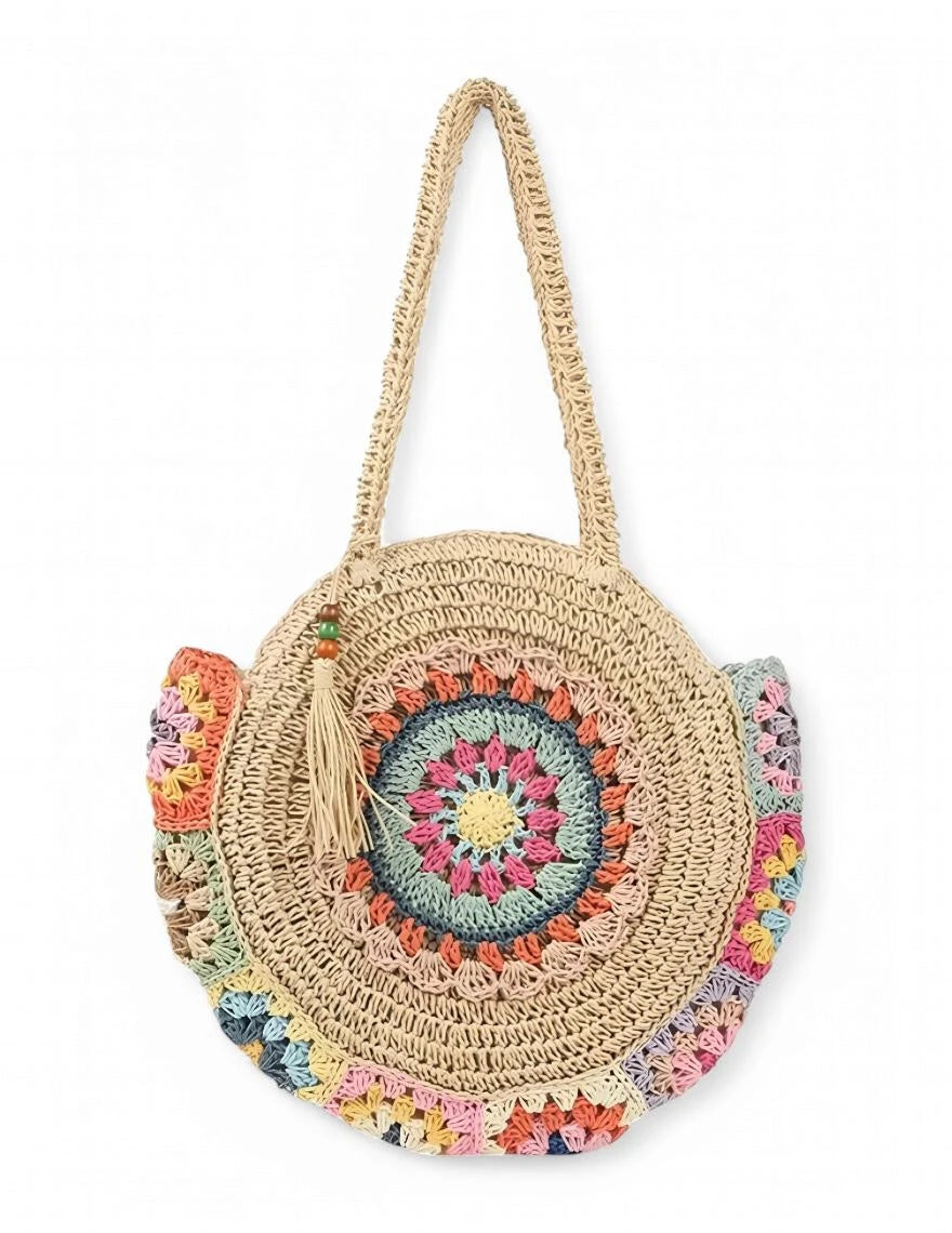 Colourful Round Crochet Tote Bag in Multicolour & Taupe