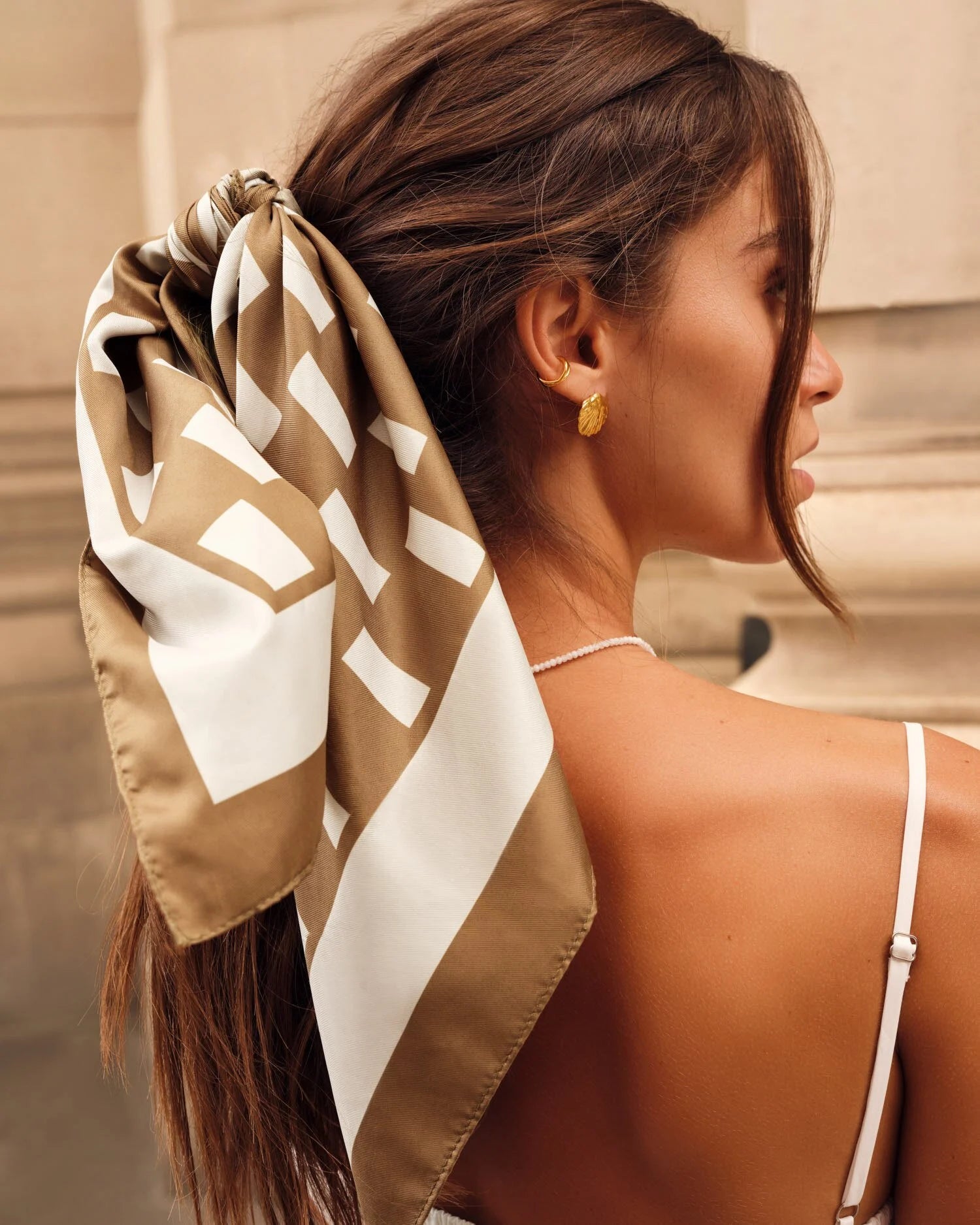 Katie Loxton Checkered Satin Multiway Scarf in Off White & Caramel