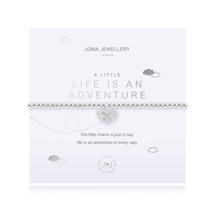 This 'Life Is An Adventure' bracelet features a beautiful silver plated stretch design and the sweetest little heart charm with a cut-out plane shape detail.