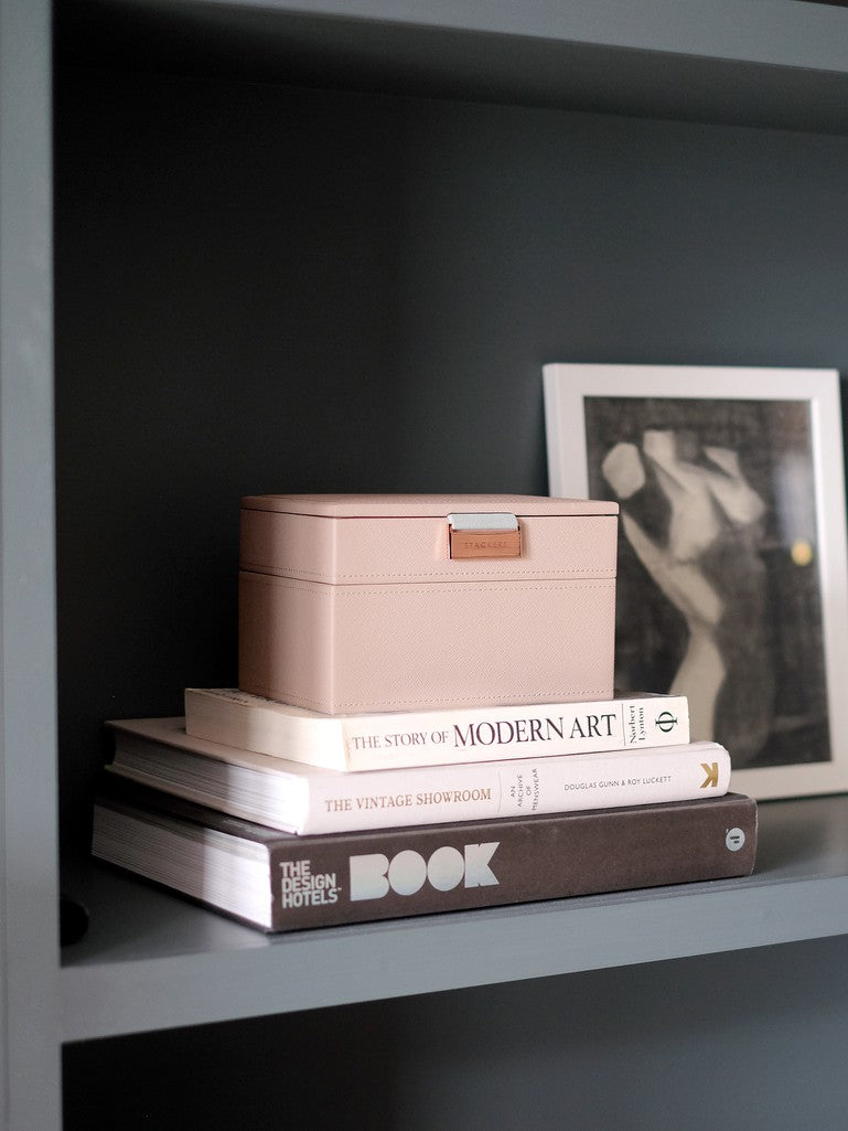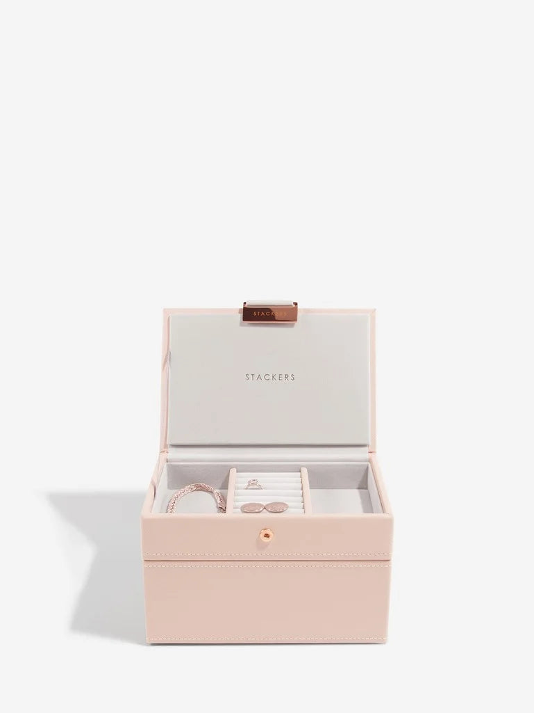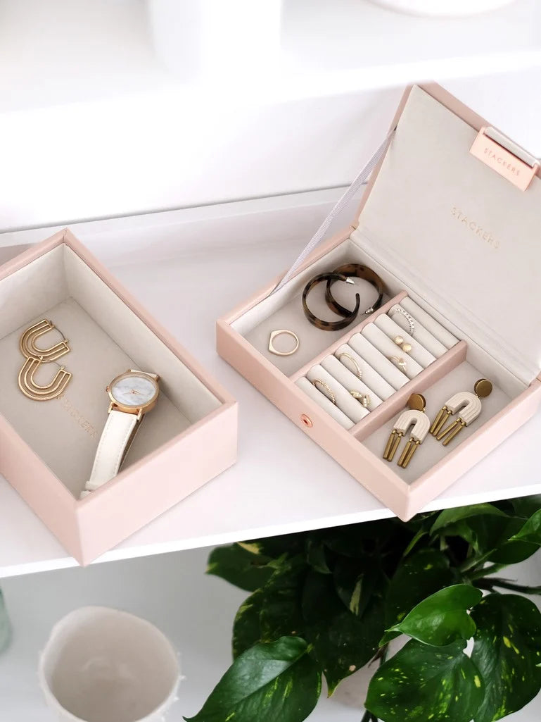 Say goodbye to tangled necklaces and misplaced earrings with our Blush Mini Jewellery Box Set. With a luxurious velvet lining and faux-leather exterior, it's both stylish and functional. The unique stackable design allows for easy access to all your favorite pieces. Add additional layers and accessories to tailor it to your needs.