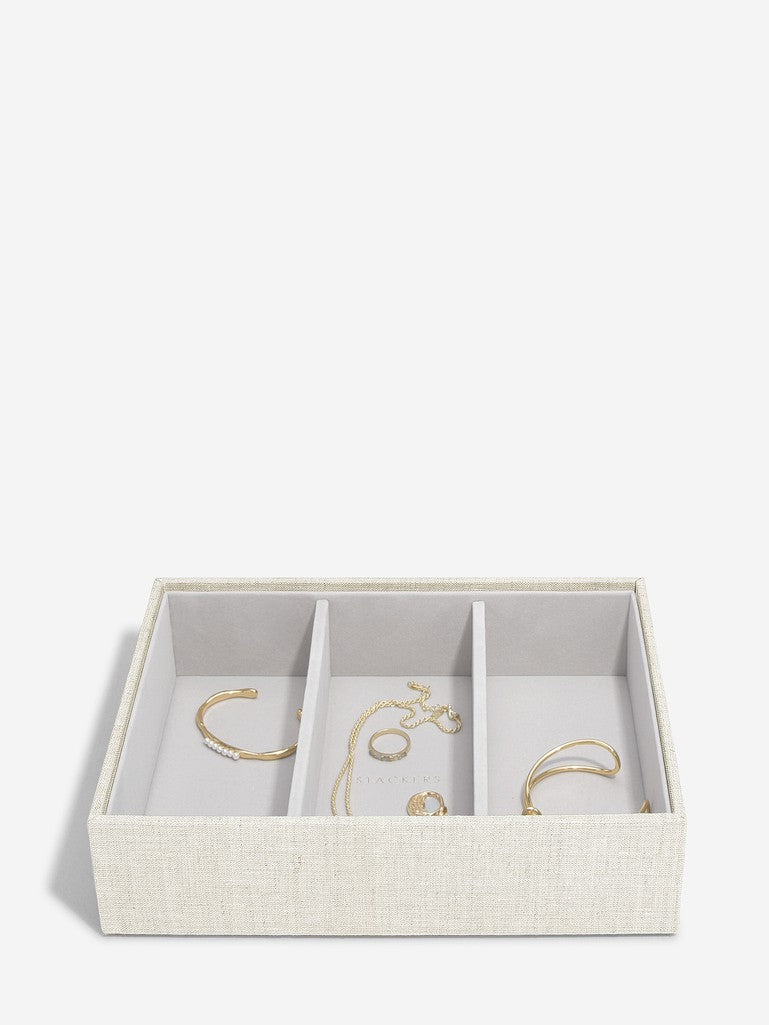 Add a playful touch to your jewellery storage with our Stackers Accessory Layer in Linen. This unique layer is deeper, perfect for storing watches and larger accessories with its 3 sections. Mix and match with other Stackers layers and accessories for a customisable solution. Lined with luxurious velvet to keep your jewels safe.