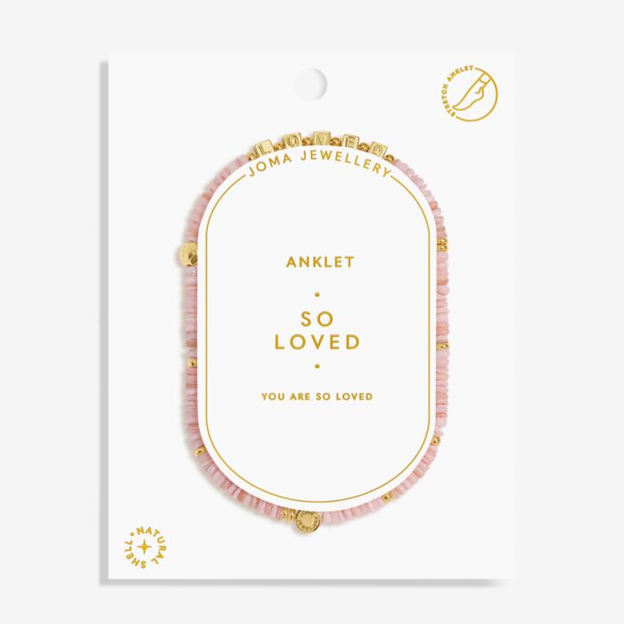 Celebrate those special moments with our So Loved Anklet, a stunning piece from the Happy Little Moments Collection. Crafted with multicoloured natural shells, gleaming alphabet beads, and charming coastal-inspired details, this stretch ankle bracelet brings effortless summer style to any beach lover. The delicate gold plating catches the light beautifully, while the heartfelt 'So Loved' sentiment stamped on its accompanying card makes it the perfect gift to show someone just how much they mean to you. Slip it on and let the good vibes flow all season long.