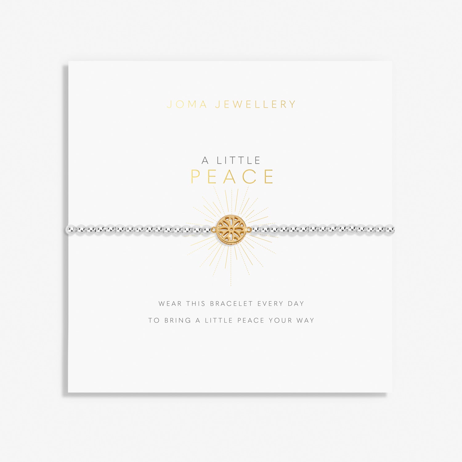 Spread joy and bring A Little peace your way with Joma's "A Little Peace" Bracelet. This signature beaded design features a gold-plated disc charm, symbolizing the peace you wish for. Perfect for any wrist, this bracelet is ready to celebrate life's treasured moments and make a sweet addition to any stack.
