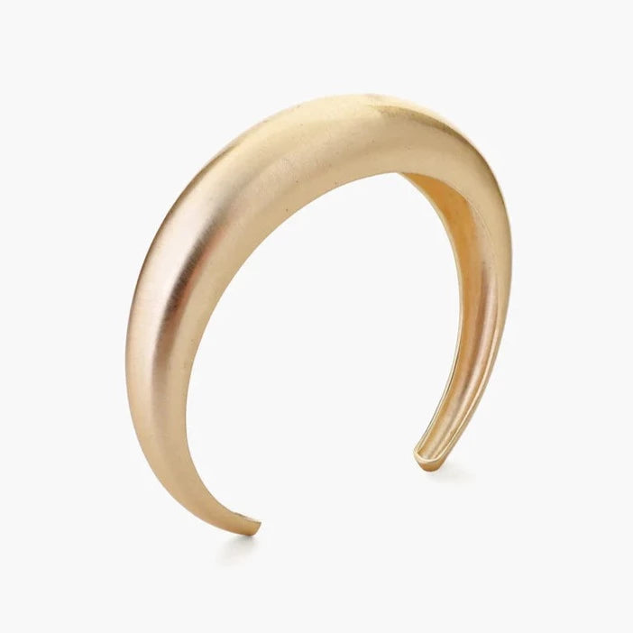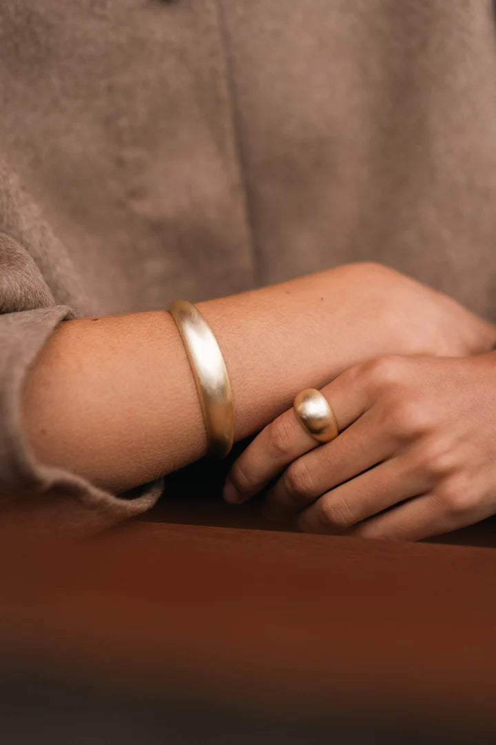 This Hush Bangle in Gold is sure to make a statement! With its dome-shaped open design and brushed finish, you'll be turning heads everywhere you go. Step into the room and let the bangle do the talking - your presence will be more than enough!