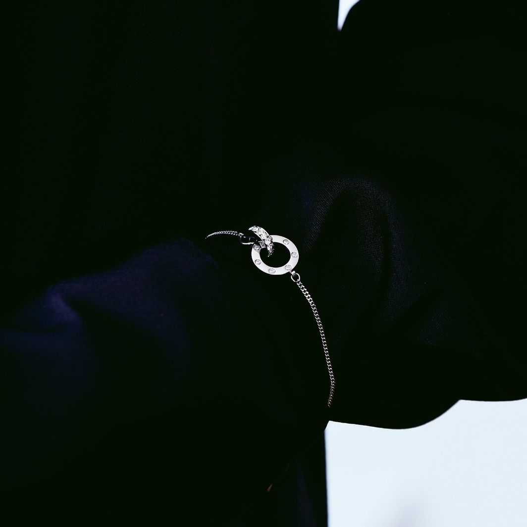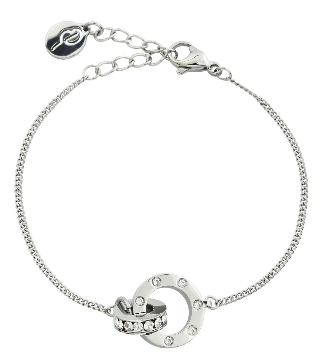 DIAMETER LARGE RING 14 MM, SMALL RING 10 MM, ADJUSTABLE LENGHT OF BRACELET 16-19 CM. CUBIC ZIRCONIA, SHINY STAINLESS STEEL. NICKEL SAFE.