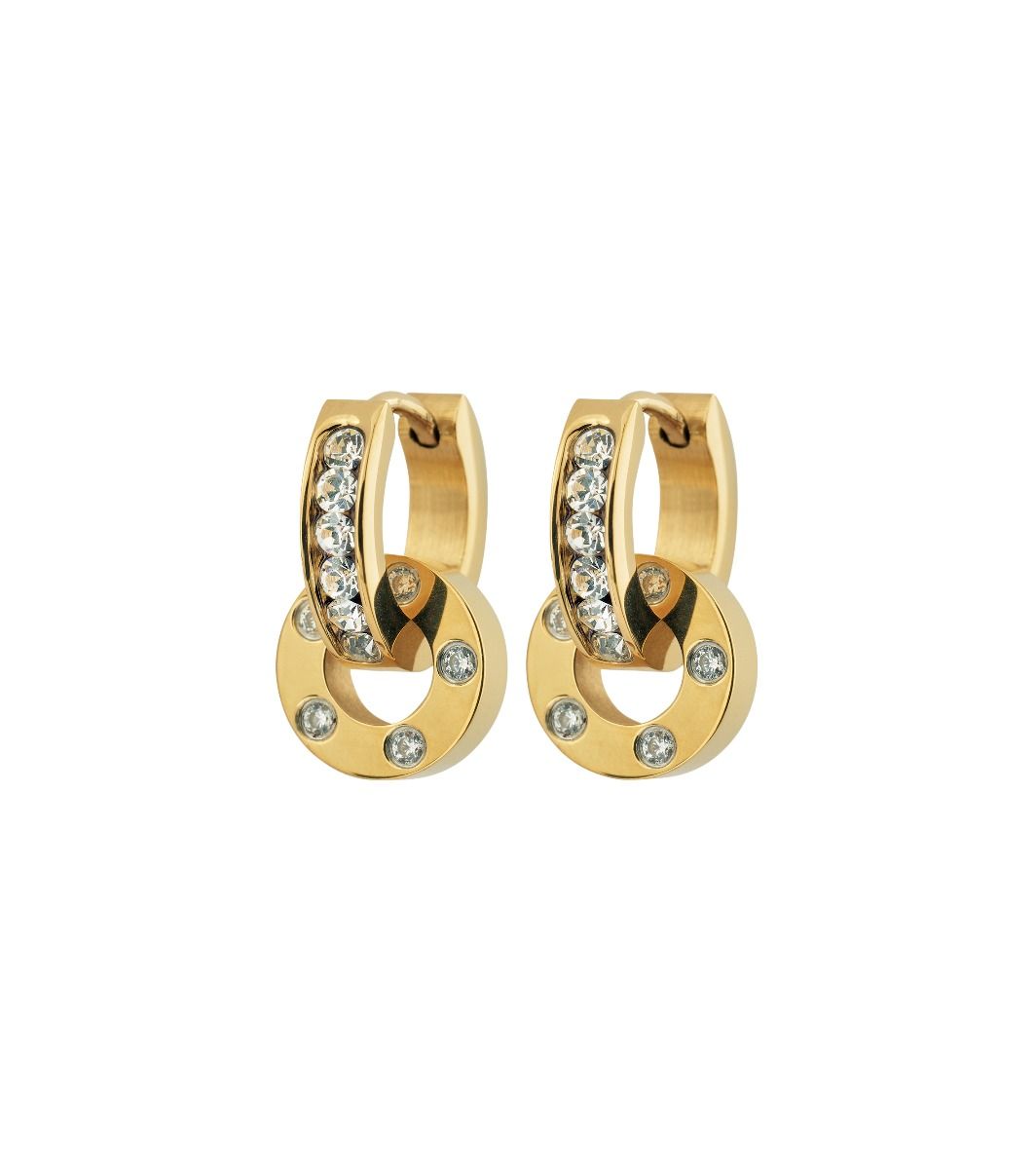 DIAMETER LARGE RING 13 MM, SMALL RING 10 MM, TOTAL HEIGNT 17 MM. CUBIC ZIRCONIA, SHINY 14K GOLD PLATED STAINLESS STEEL. NICKEL SAFE.