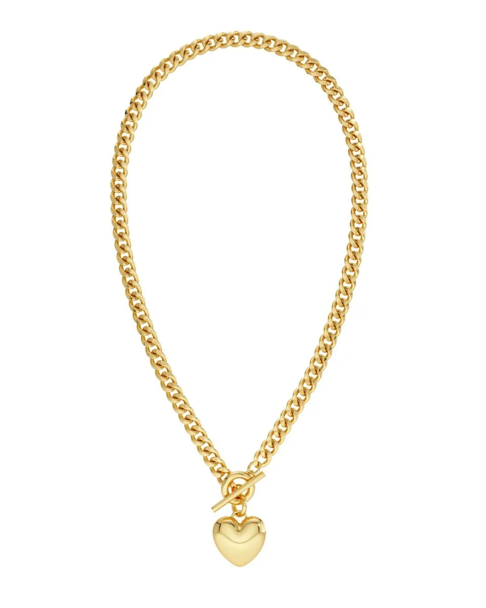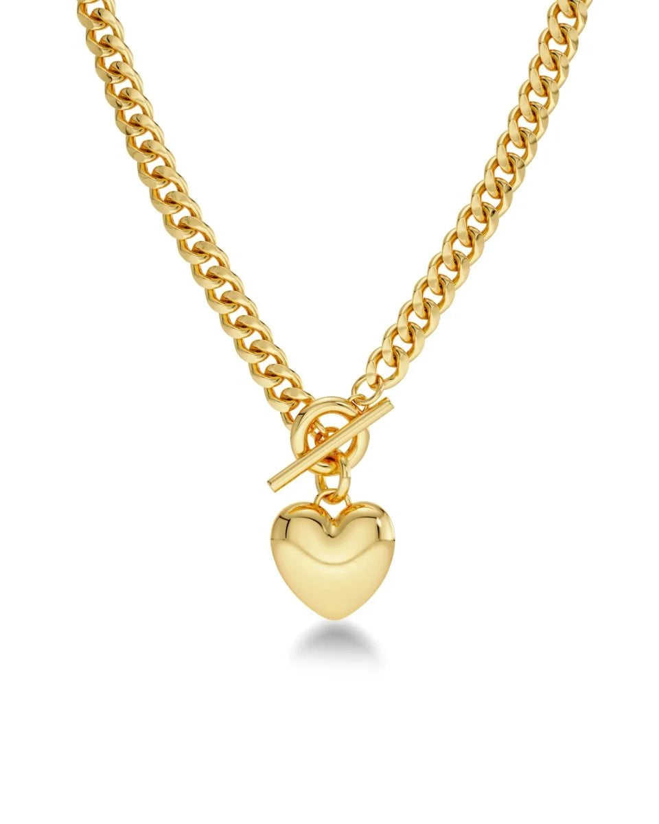 Introducing the Barley Maxi Necklace, a versatile and stylish piece that is sure to become a personal favorite. This necklace features a trendy curb chain with a large heart pendant at the T-shaped lock. It's perfect for everyday wear or as a thoughtful gift. Made with shiny 14K gold plating, it offers timeless style that can be easily paired with other pieces from the Barley collection.