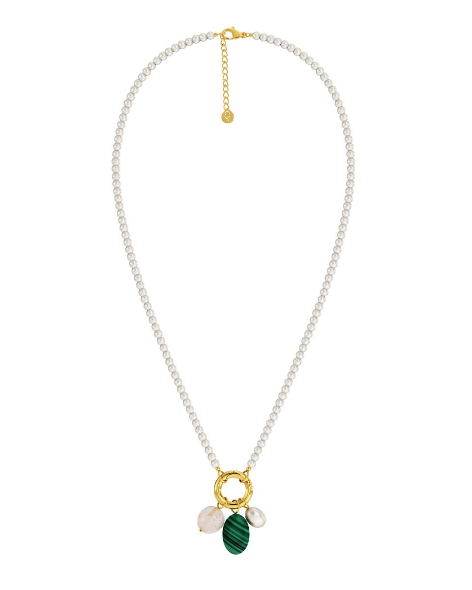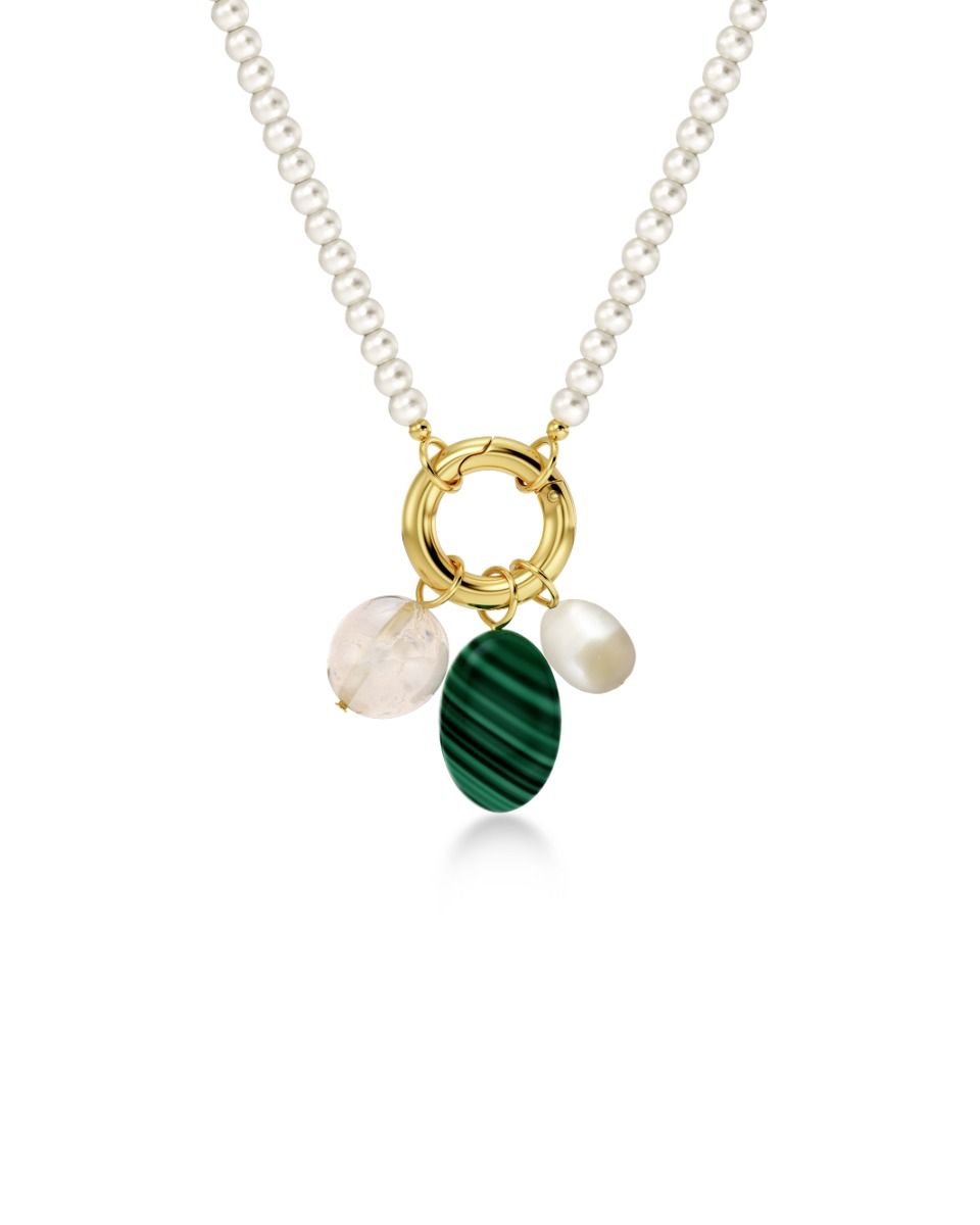 - Mother of Pearl, freshwater pearl, malachite, rose quartz, shiny 14K gold plating on stainless steel