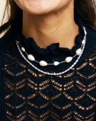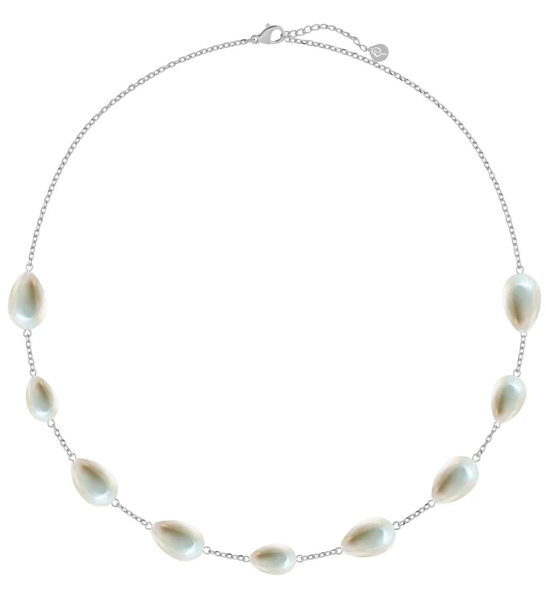Elevate your party style with the Angeleno Necklace! This playful piece captures the 'pearls meet chain' trend with stunning teardrop-shaped mother-of-pearl beads. Choose from three sizes of pearls attached to a shiny stainless steel anchor chain. Complete the look with the bracelet and earrings for a quirky, fun, and stunningly sophisticated style!
