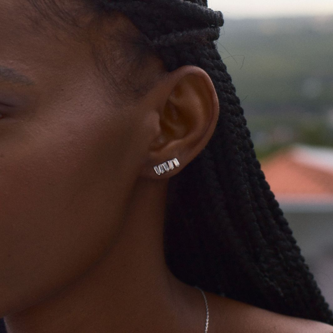 Looking for a touch of vintage luxury? Look no further! Rey Studs in Steel feature a unique zigzag setting showcasing five clear baguette-cut stones. Perfect for everyday wear or dressing up for special occasions. Add some shine to your style with these gorgeous studs.