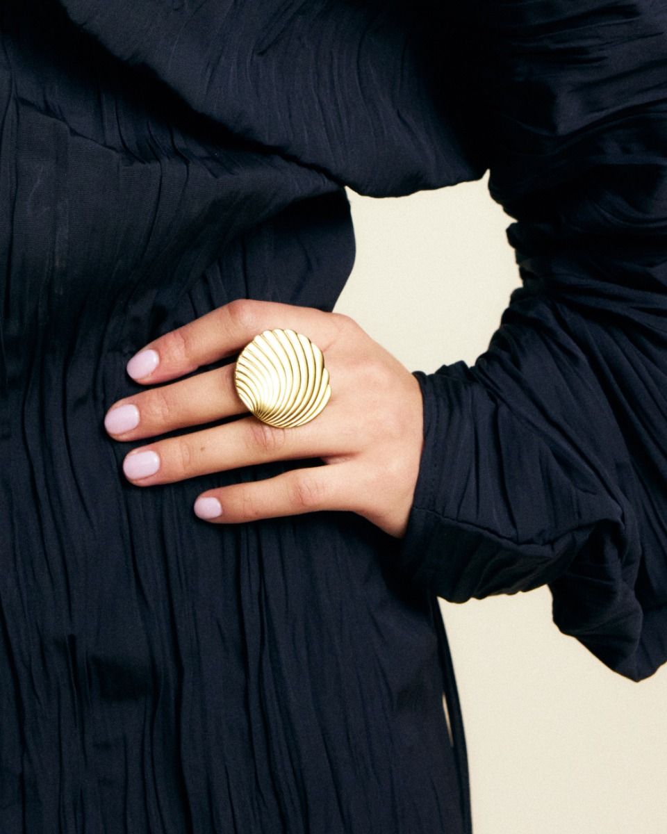 Add a touch of whimsy and charm to any outfit with the Edblad Shelli Ring in Gold. This dainty ring features a thin seashell design that is both beautiful and slightly abstract, making it a statement piece at any event. For a bold and eye-catching look, pair it with the large necklace. Made with shiny 14K gold plating, this ring can be paired with other pieces from the Shelli collection for a complete and stylish look.