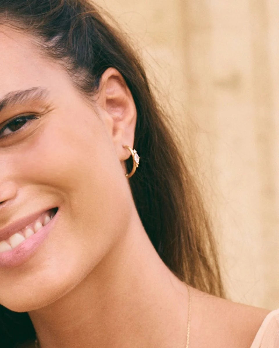 Add a touch of timeless romance to any outfit with Edblad's Trinny Hoop Earrings in Gold. Perfect for special occasions like weddings, these understated hoops feature three delicate stones reminiscent of dewdrops. Made with 14K gold plating for a luxurious touch.