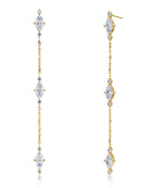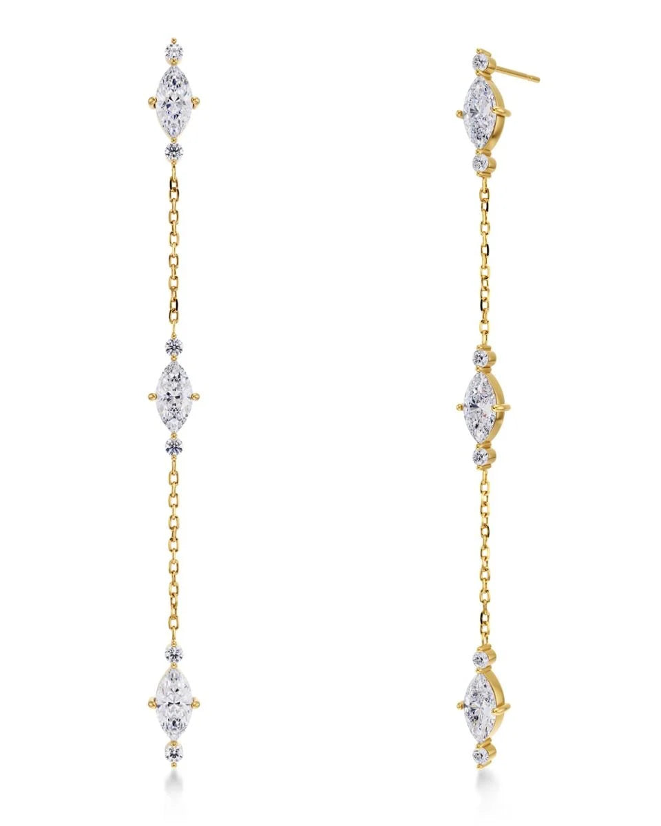 Introducing Edblad Trinny Drop Earrings: a timeless and romantic line perfect for special occasions! These 14K gold plated 'shoulder dusters' feature graceful movement with three clusters of sparkling stones, resembling beautiful dewdrops on a faceted anchor chain. Make every day special with Trinny!
