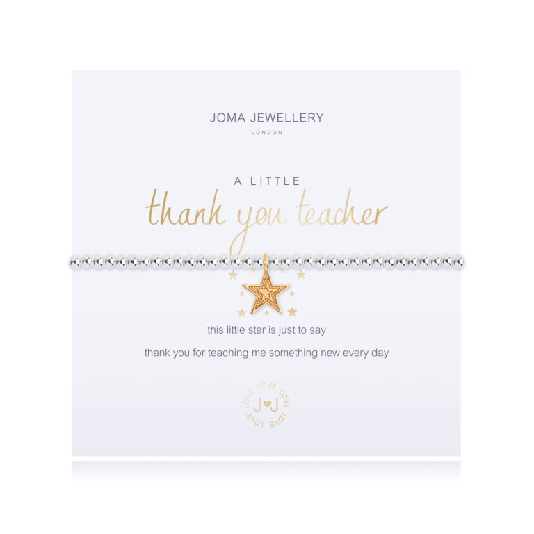 Show your appreciation for their hard work with Joma's "A Little Thank You Teacher" Bracelet. A sparkling gold star charm and silver-plated beads make this a lasting reminder of your gratitude. The perfect end-of-term gift to celebrate their dedication and make memories that will last forever.