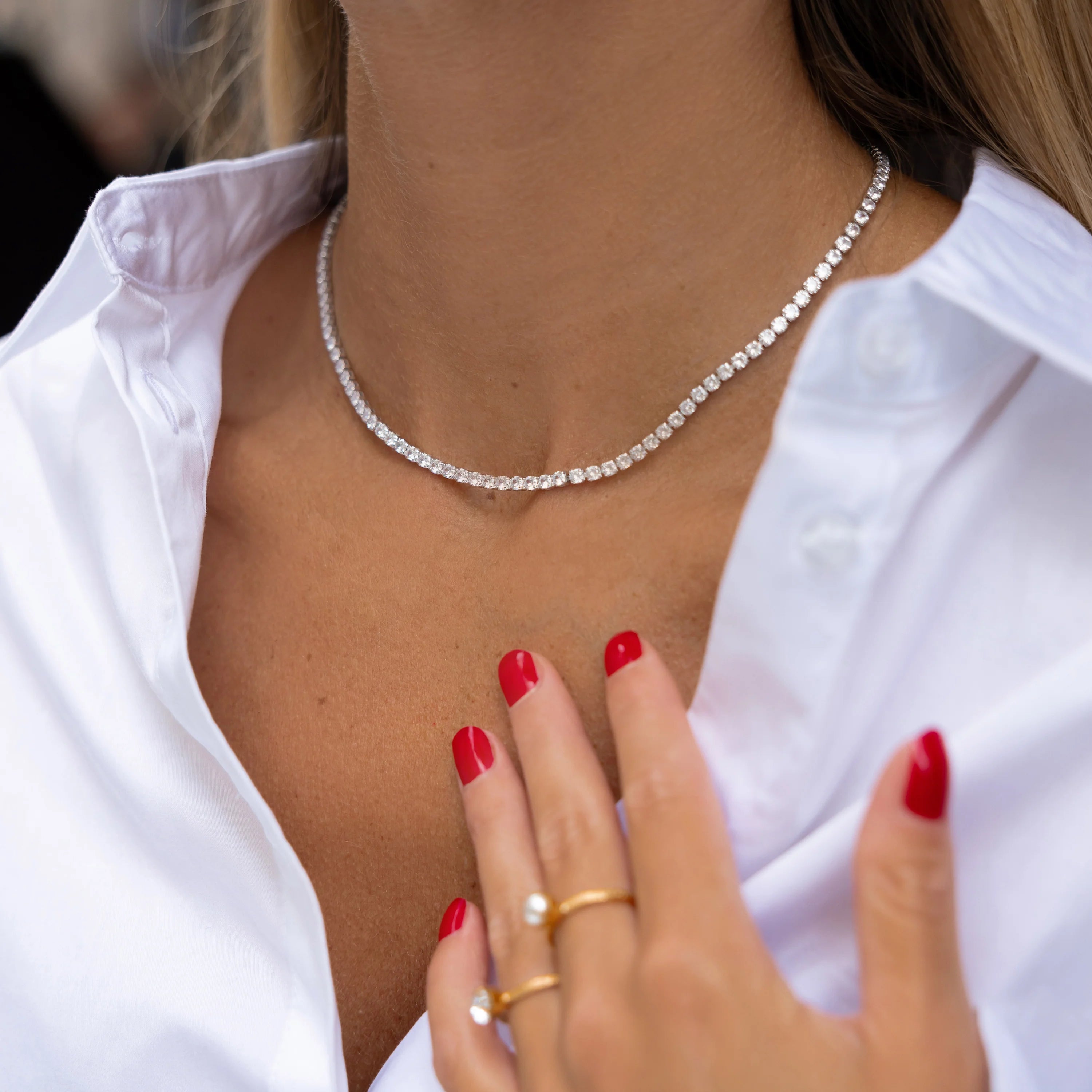 Add some sparkle and elegance to your outfit with the Mini Zara Necklace! Made of Cubic zirconia, this necklace offers the brilliance and clarity of a diamond in a more affordable and sustainable option. Perfect for any occasion, it's a timeless and luxurious piece that will elevate any look.