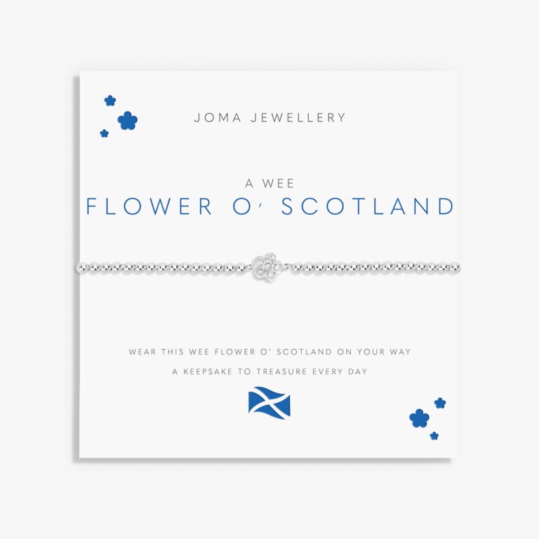 Add a bit of Scottish charm to your look with the Joma "A Wee Flower O Scotland" Bracelet. This silver-plated bracelet features a delicate flower charm and comes presented on a sentiment-stamped card. A perfect gift for anyone who loves Scotland and a little bit of whimsy!