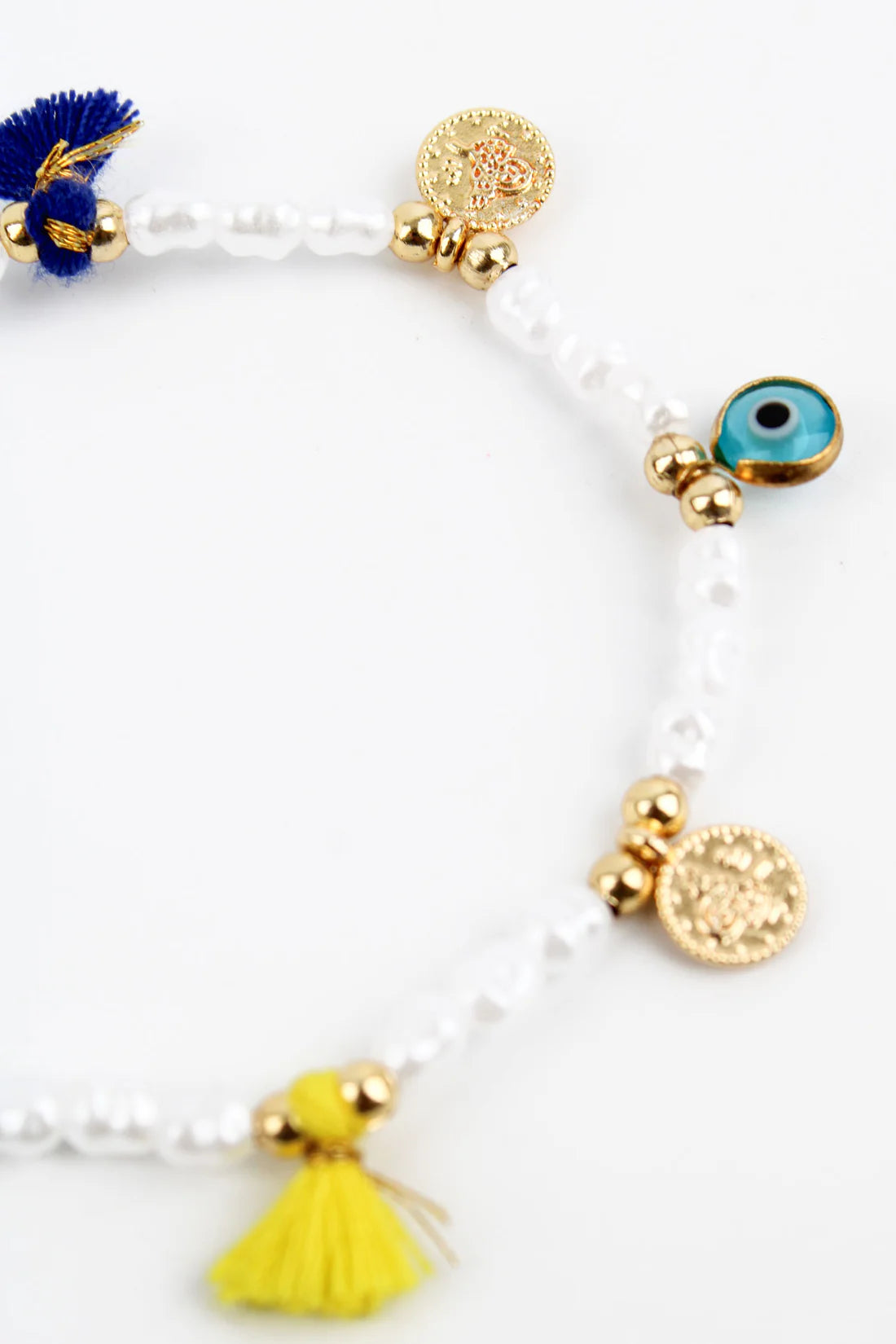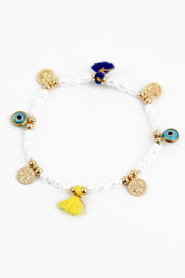 Add a touch of boho-chic to your summer look with My Doris Pearl Charm & Tassel Beaded Stretch Bracelet. Handmade in Turkey, this vibrant accessory features playful tassels and beautifully crafted charms. Perfect for any summer adventure!