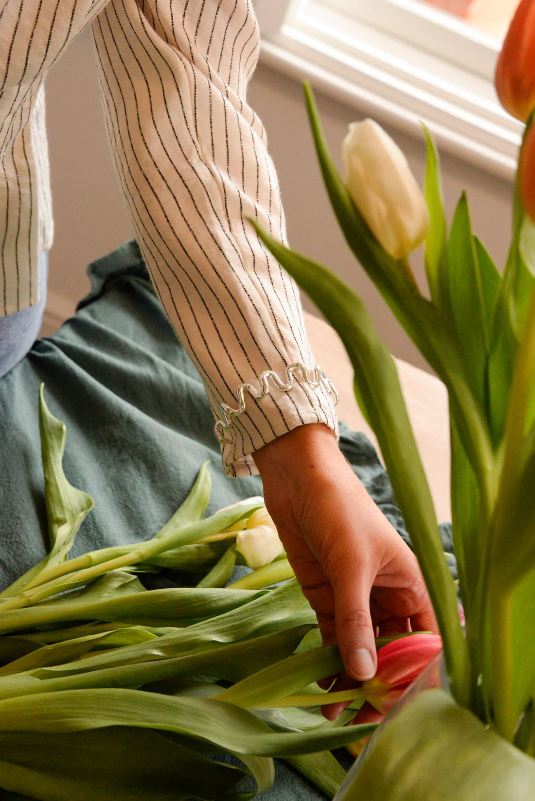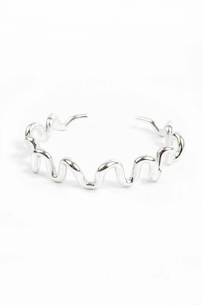 Introducing the My Doris Wiggle Bangle in Silver - a stylish and trendy addition to any outfit! This adjustable, handcrafted bangle features a unique wiggle shape and can be worn alone or stacked with other styles. Handmade in India by skilled artisans and also available in gold, it's the perfect accessory for any occasion. Complete the look with the matching earrings.