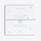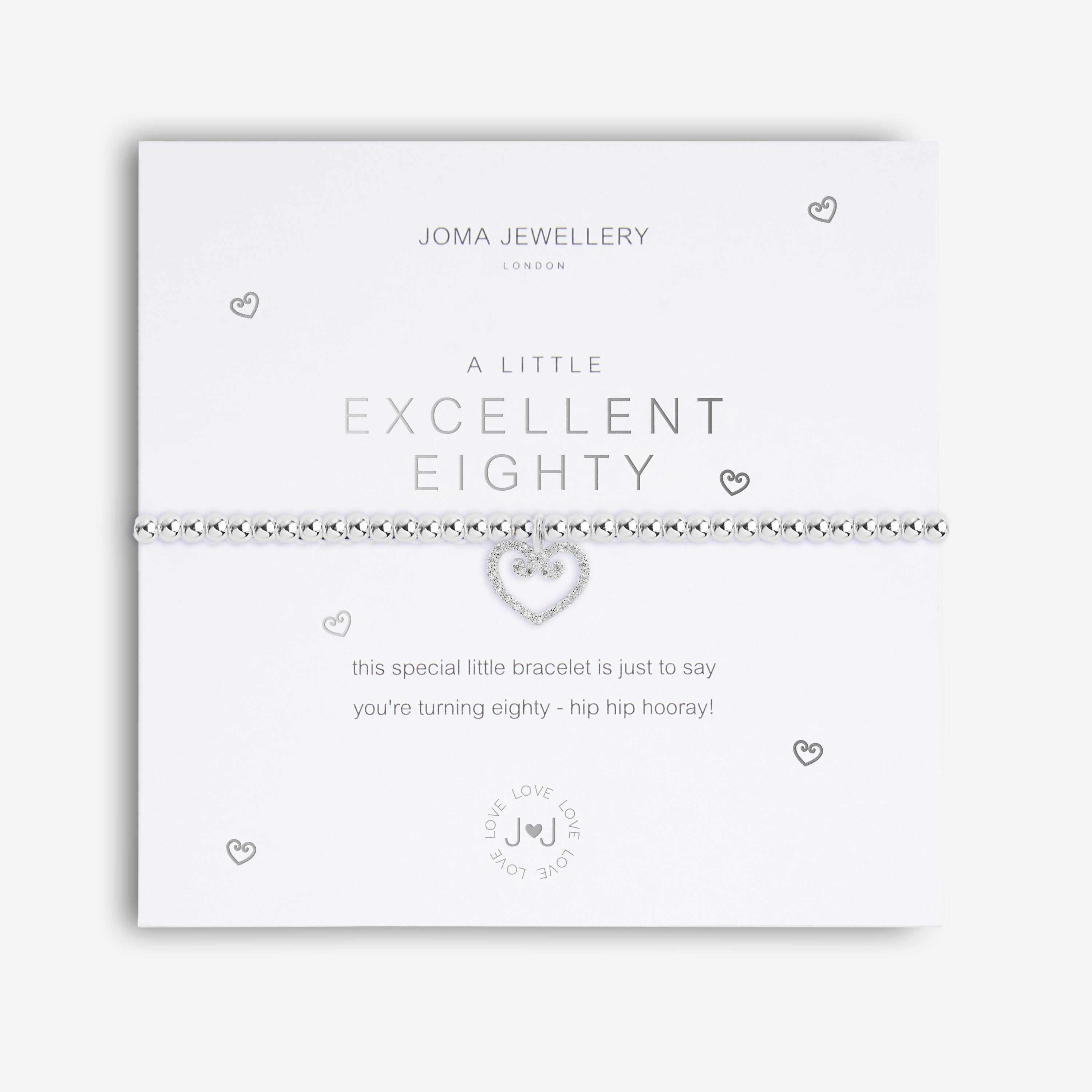 Celebrate the 80th birthday of your loved one with our Joma "A Little Excellent Eighty" Bracelet. Featuring silver-plating, a sparkling charm, and stretch bead style, this special bracelet is a perfect way to say "hip hip hooray!" to the birthday girl. Time to add some sparkle and joy to the milestone celebrations!
