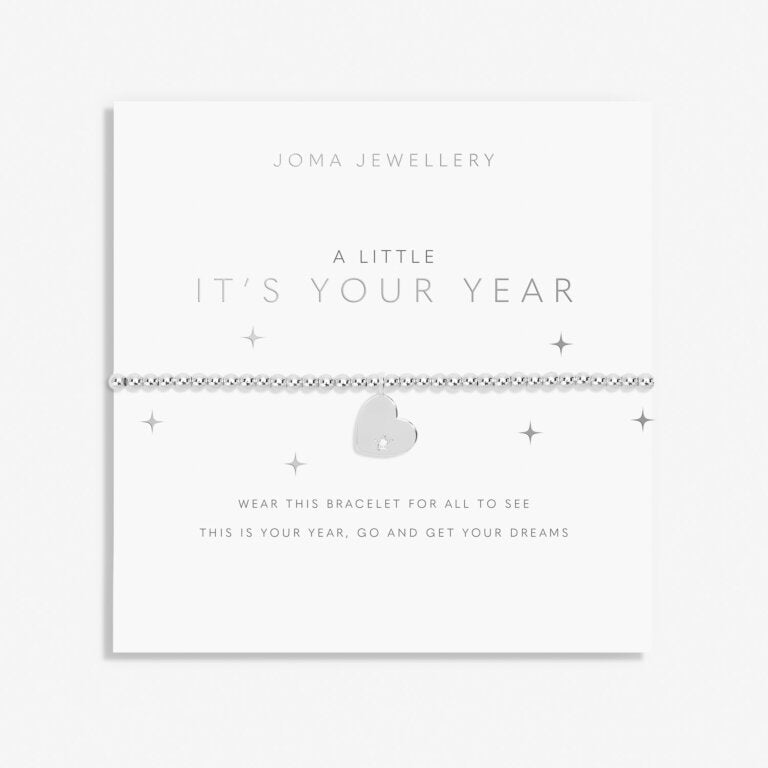 Claim your year with the Joma 'A Little It's Your Year' Bracelet! The captivating stretch design and precious silver-plated heart charm make it a must-have accessory. Share the love and positivity with this fun and quirky bracelet.