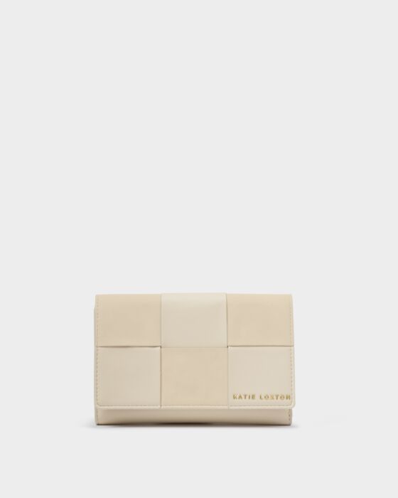 Meet your new go-to purse! This Katie Loxton Taya style combines texture and practicality with its eye-catching woven detail in a chic off-white shade. The faux suede and vegan leather construction keeps things cruelty-free without compromising on style. Nine card slots keep your essentials organised, while the dedicated zip pocket handles coins and notes separately. Topped with gleaming gold-tone hardware and a secure popper closure, it's the perfect blend of fun fashion and functional design.