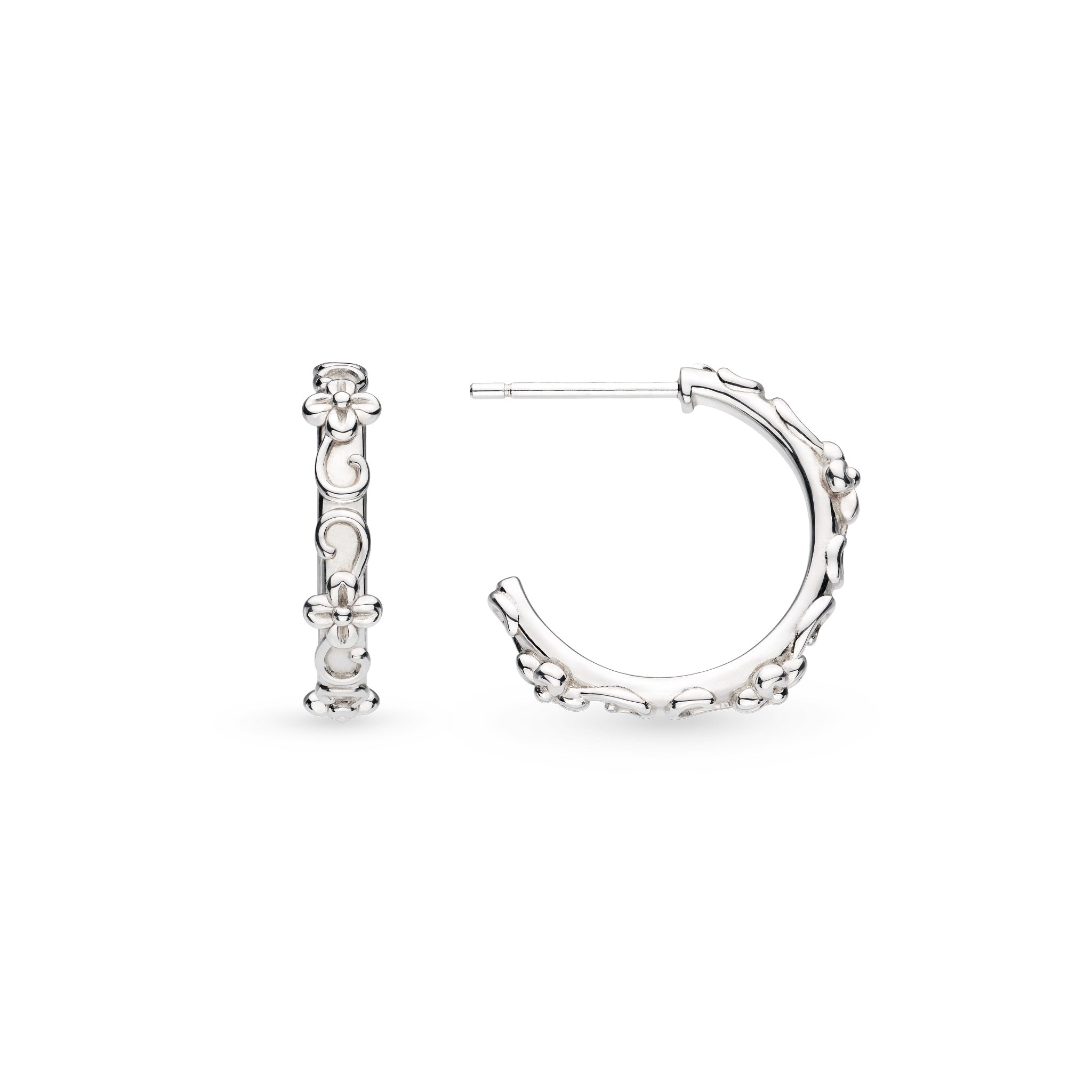 Elevate your style with Kit Heath's Blossom Honey Flower Hoop Earrings. Crafted from premium Sterling Silver, their slender semi-hoop design features whimsical Honey Flower motifs and intricate textures. Finished with Rhodium for lasting shine, these earrings are perfect for everyday wear. (Butterfly fitting included!)