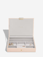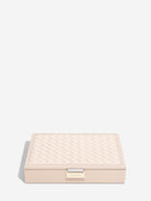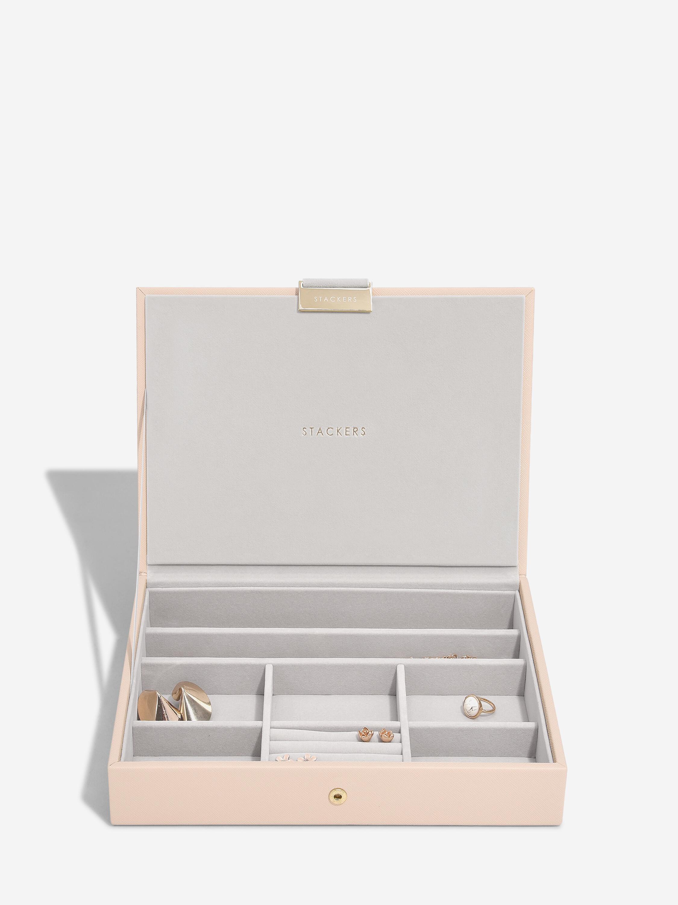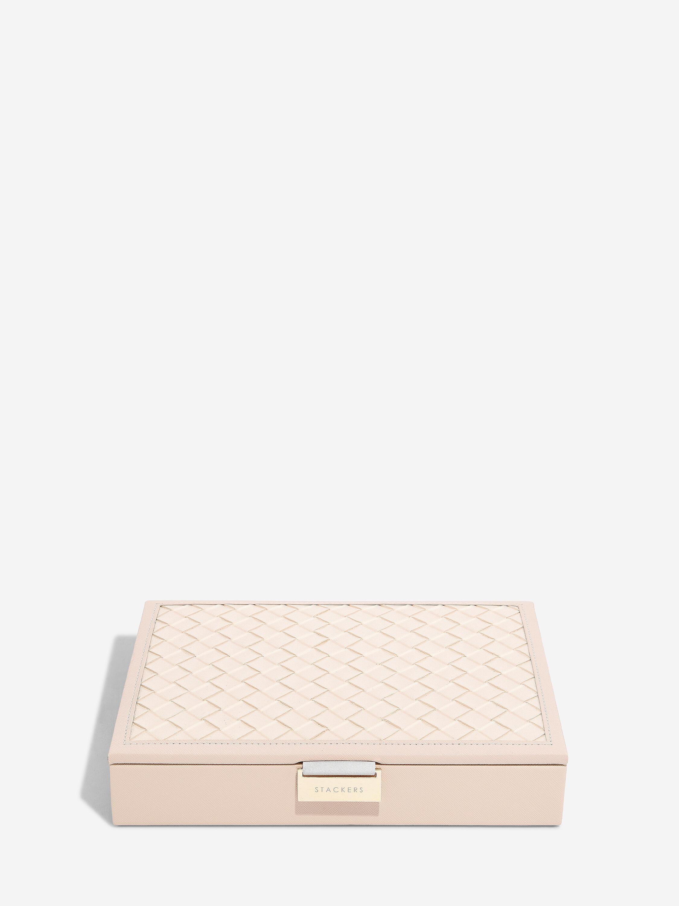 Introduce timeless elegance to your jewellery storage with the Stackers Classic Box Lid Layer in Blush Woven. This sophisticated piece serves as both a standalone dresser accent and the foundation of a customisable stackable system. The luxurious velvet-lined interior safeguards your most treasured pieces whilst the thoughtfully designed compartments accommodate rings, earrings, necklaces and bracelets with ease. Enhance functionality by pairing with compatible accessories including pendant, earring, and charm bar inserts. Create a jewellery organisation solution tailored precisely to your collection's unique needs.