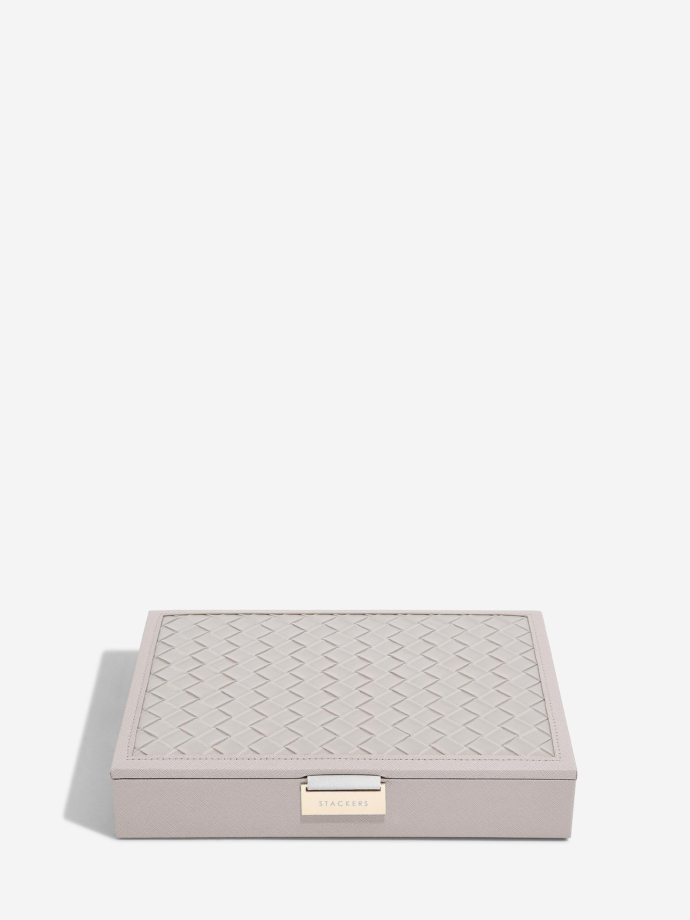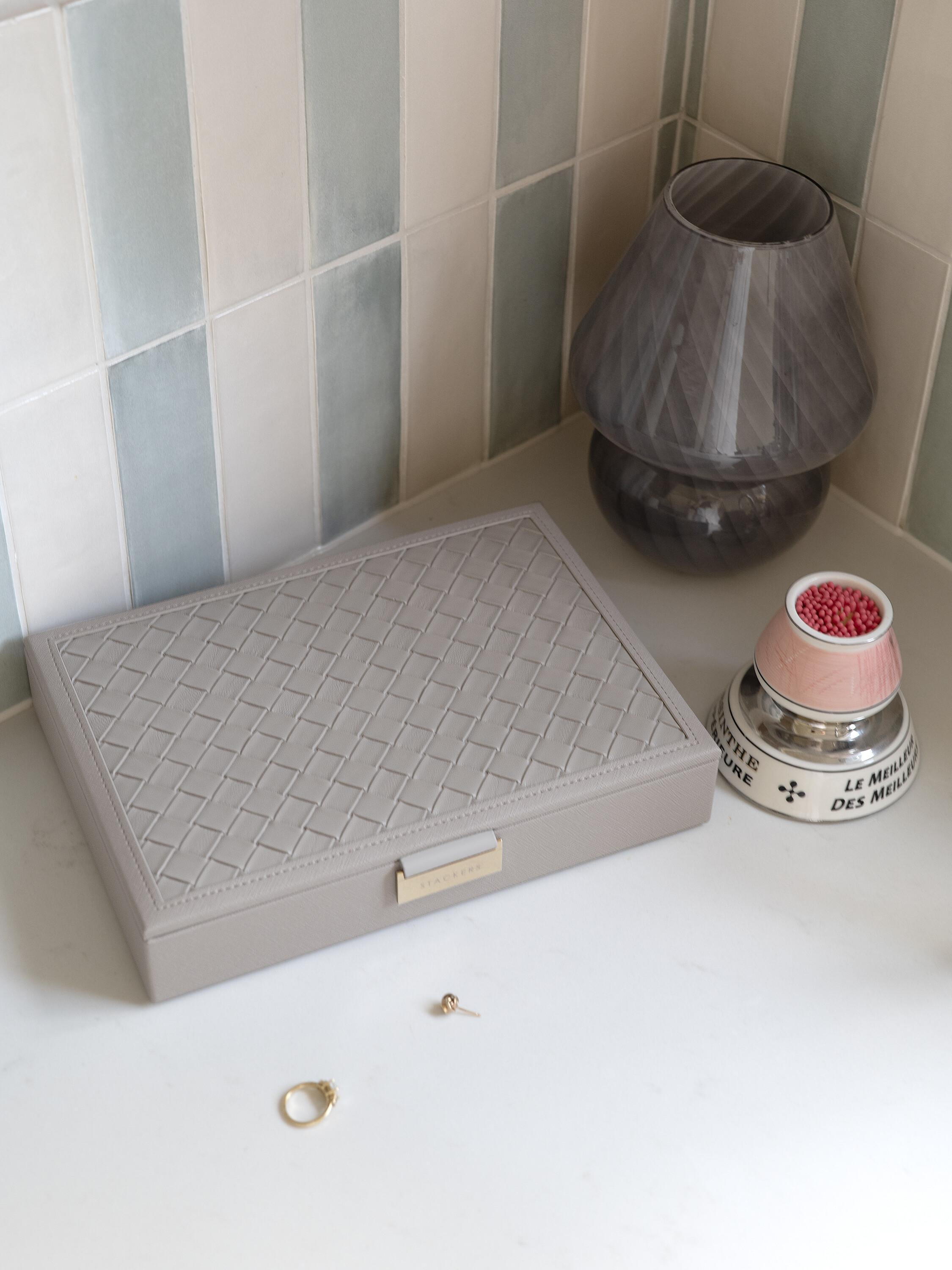 Introduce timeless elegance to your jewellery storage with the Stackers Classic Box Lid Layer in Taupe Woven. This sophisticated piece serves as both a standalone dresser accent and the foundation of a customisable stackable system. The lid features versatile compartments designed to accommodate rings, earrings, necklaces, and bracelets, whilst remaining compatible with dedicated accessories including pendant holders, earring organisers, and charm bars. Crafted with a sumptuous velvet-lined interior, it ensures your treasured pieces remain protected from damage and dust. Build your perfect jewellery box by selecting additional layers that match your collection's unique needs.