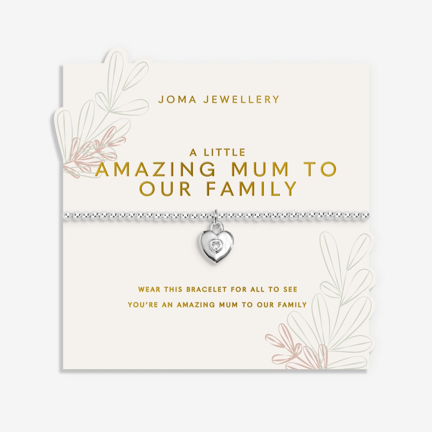 Celebrate the incredible mum in your life with this charming Mother's Day bracelet from Joma Jewellery. Strung with delicate silver-plated beads and topped with a sparkling cubic zirconia heart charm, it's a wearable reminder of the love that grows stronger with every shared moment. Presented on a gorgeous cut-out floral card in soft sage green, blush pink, and buttercream tones, this thoughtful gift honours every mum and mother figure who's been there through the cheers, the tears, and all the chapters in between. A treasure she'll cherish year after year.