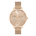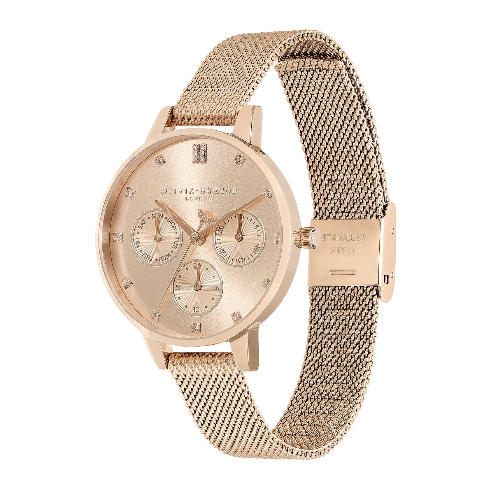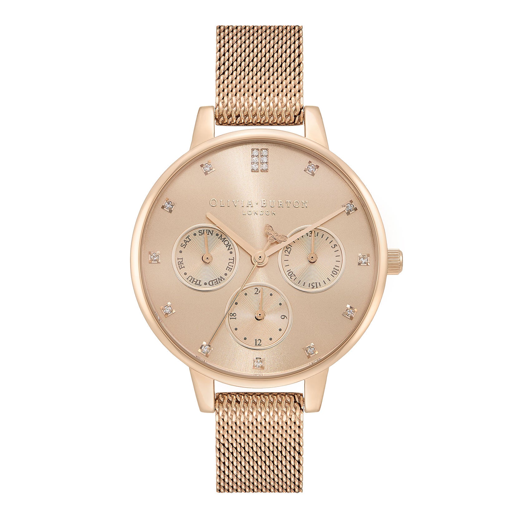 This luxe Multifunction watch contains a chronograph dial with a reflective sunray finish, creating a business-chic feel. Elegant yet unique, the dial features subtle crystal markers and our signature bee detailing on the second hand. Complete with a carnation gold mesh strap for an elevated finish.