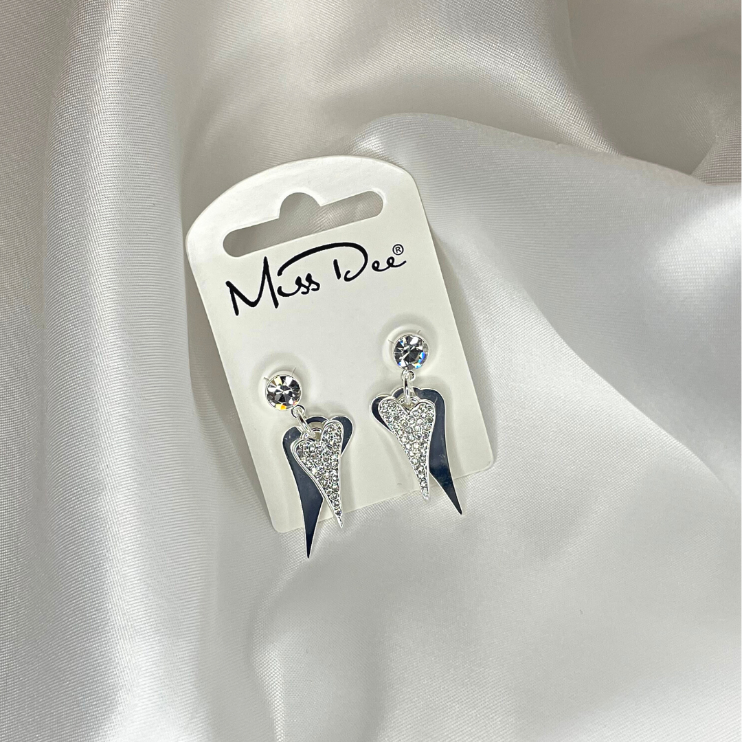 Get double the love with Miss Dee's silver crystal earrings! These playful double heart earrings add a touch of sparkle and charm to any outfit. Perfect for those who love to have fun and make a statement. (Jazz up your ear game with these crystal earrings! 💕)