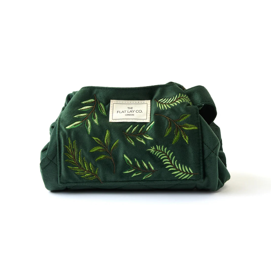 Transform your makeup routine with this ingenious flat-lay bag that unfolds into a spacious mat in seconds—no more digging through cluttered pouches! The Forest Green Leaves Print features a gorgeous botanical design with intricately embroidered leaves and ferns on sumptuous deep green velvet. Quick-release drawstring closure means you're always ready to go, whether you're jet-setting or dashing out the door. See everything at a glance, keep your cosmetics safe from spills, and enjoy a touch of nature-inspired elegance. Perfect for anyone who values both style and smart organisation.
