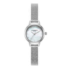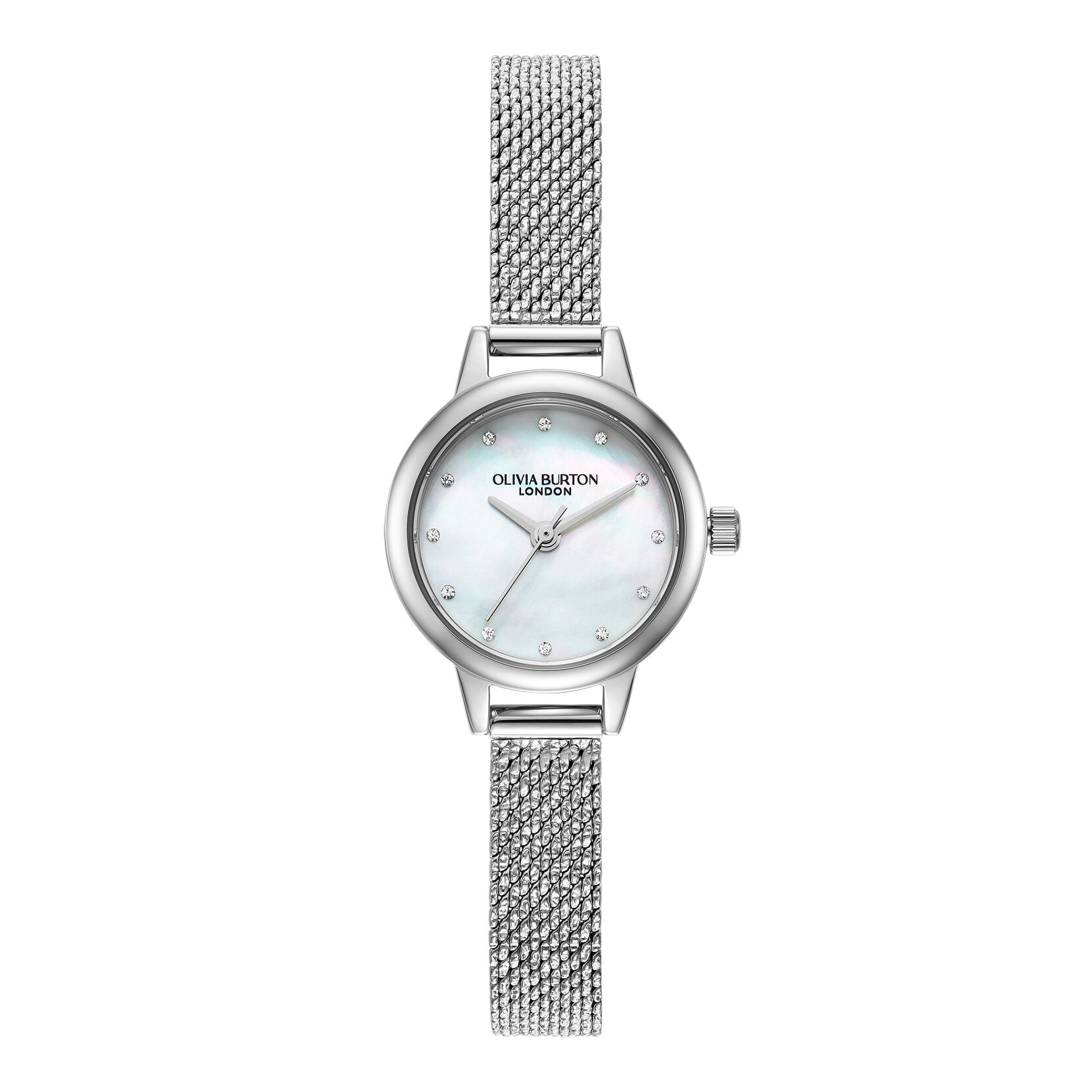 This mini dial watch is the perfect way to elevate your everyday look. Its small but striking design features an iridescent Mother of Pearl dial with crystal markers and a chic silver-tone case. The contemporary mesh strap adds a touch of sophistication. Stay classic and on-trend with Olivia Burton.
