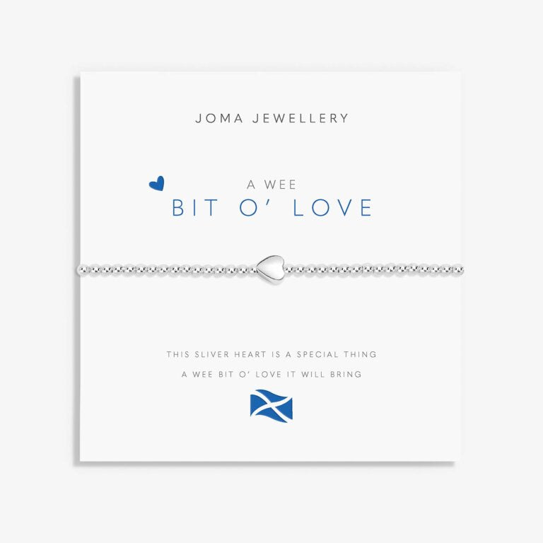 Spread a little love with Joma's "A Wee Bit O Love" Bracelet from their Scottish Collection. This silver-plated bracelet comes presented on a sentiment-stamped card, making it the perfect gift for yourself or a loved one. Share some Scottish charm and style with this playful accessory.